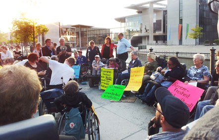 Am Abend des 11. Mai 2016 ketteten sich behinderte Menschen am Reichtagsufer in Berlin an, um zu protestieren: